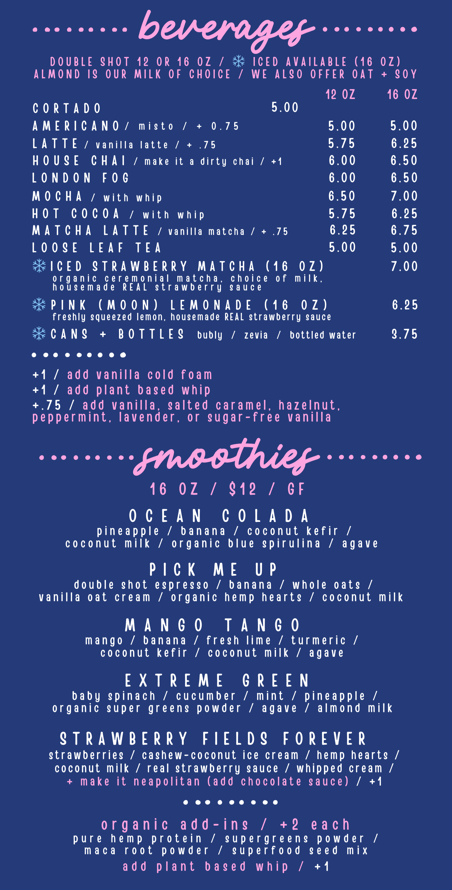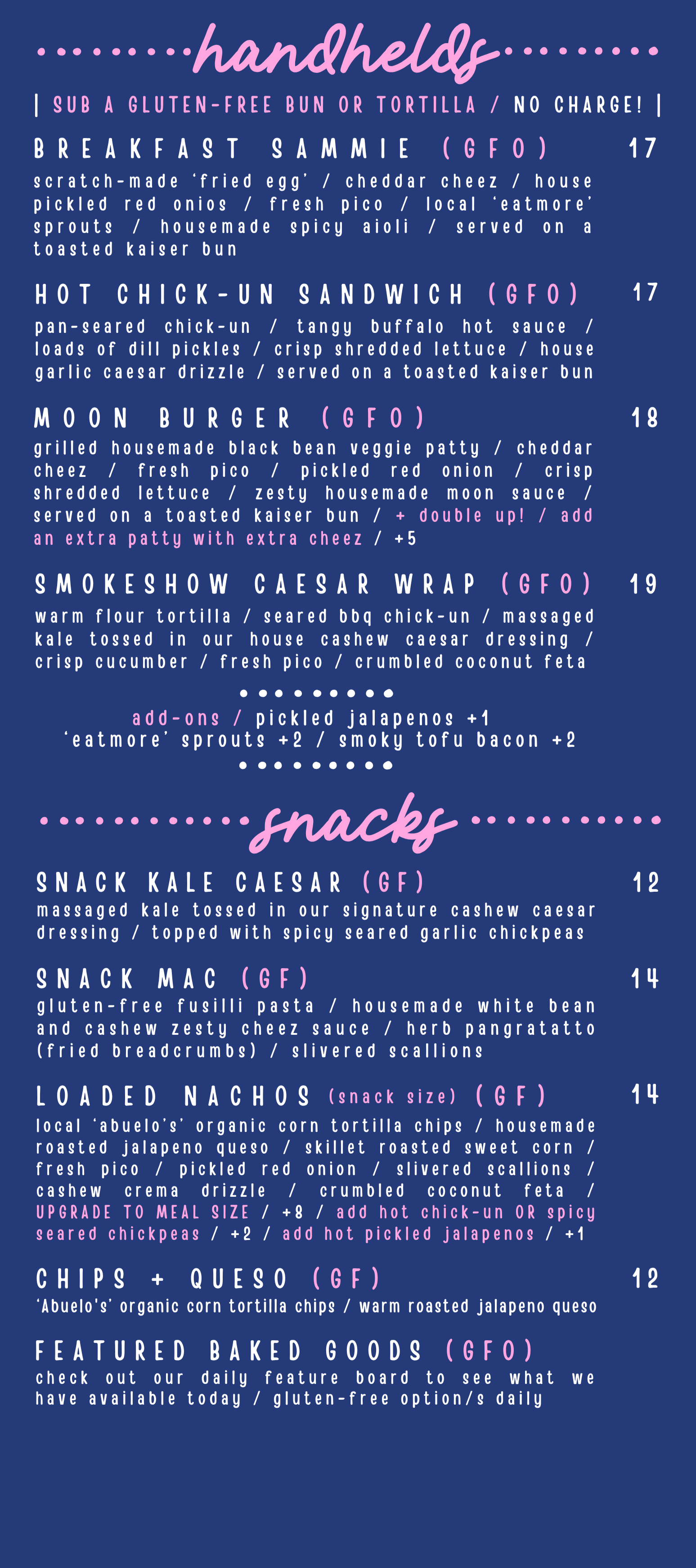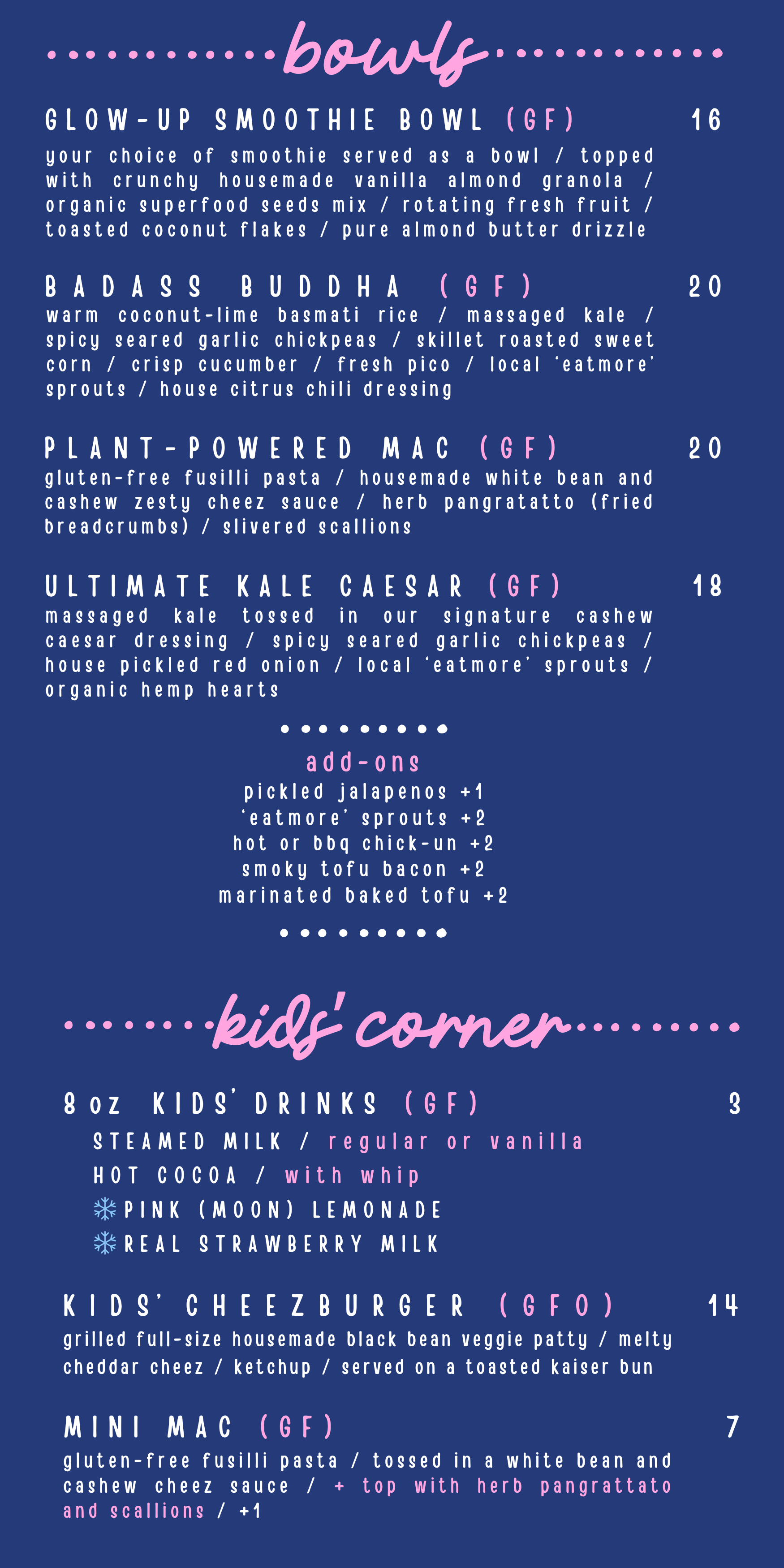 100% PLANT BASED MENUeverything on the menu is either gluten-freeor can be made gluten-free with simple substitutions Order online Order online Ready to placean order?call us at:250—207—9017 Or place an order online,for delivery or pick up. It’s easy! Order here Order here
